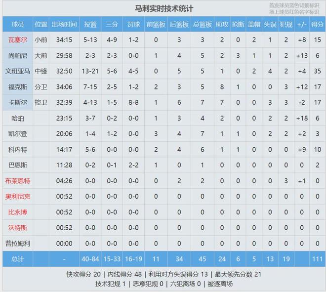 开拓者利用马刺失误,一度迫近分差,瓦塞尔三分浇灭对手反扑火焰。马刺上半场三分球18中9,开拓者三分只有20中5。第二节马刺29-28净胜1分,分差反而拉大了。半场战罢,马刺59-49领先整整10分,文班13中8砍下21分2板。