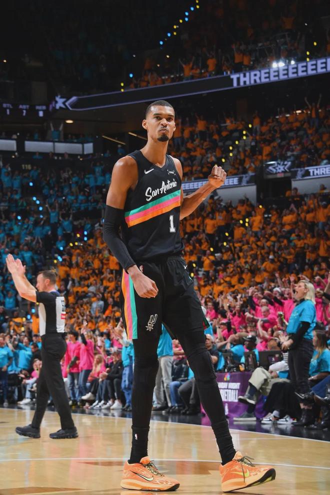 阿夫迪亚突破分球,创造了不少空位投篮的机会,但队友就是投不进。第三节还剩2分30秒,科内特补扣打进,文班在场边鼓掌庆祝。教主发现看台上有亮点,这才是顶级天赋。第四节刚开始,马刺拉开到20+,文班得分来到30+。