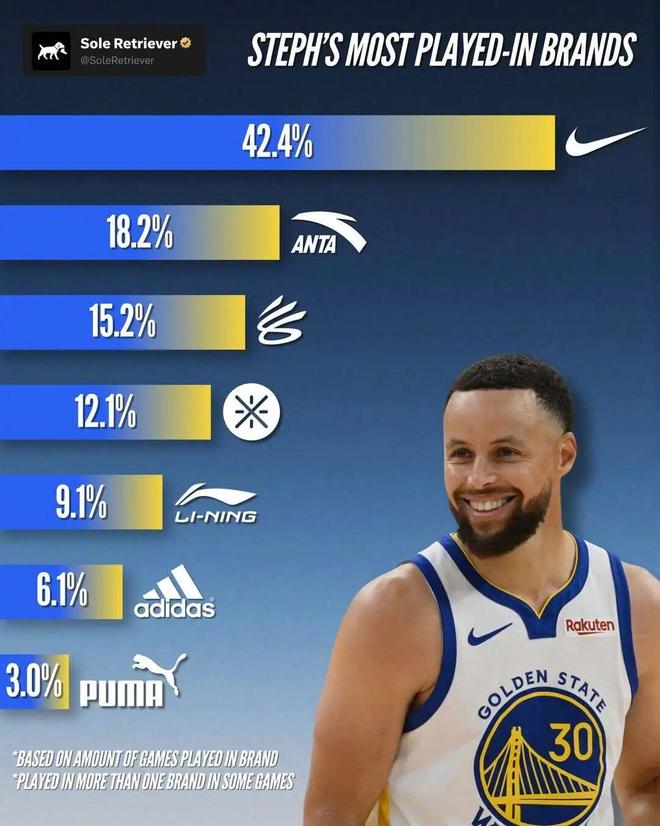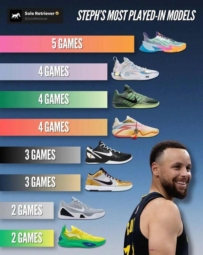 斯蒂芬-球队自由球员-库里的乱穿赛季结束了,球鞋媒体Sole Retriever对本赛季库里穿着的球鞋品牌和具体款式进行了汇总。