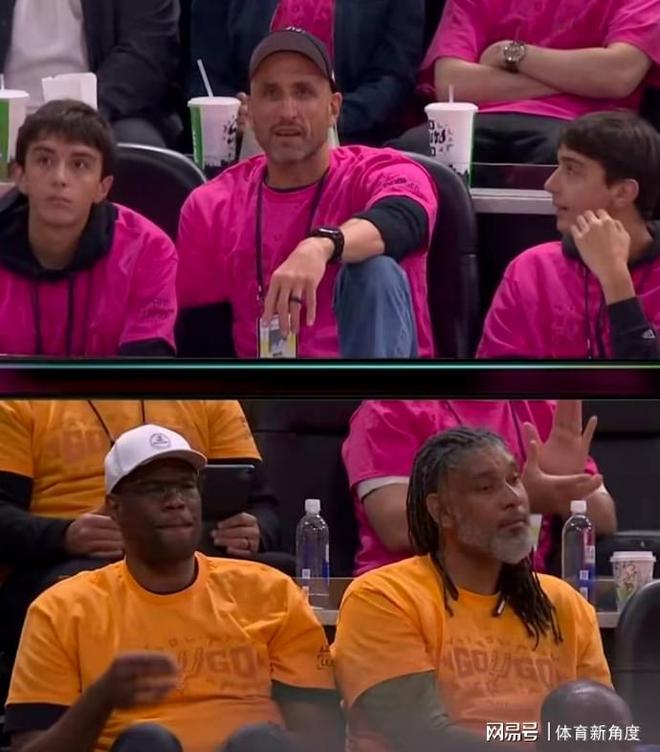 看看场边,老邓肯与另一位传奇名宿“上将”大卫·罗宾逊笑得合不拢嘴,退役后的他们,终于可以毫无顾忌地开怀大笑了。想当年,邓肯若是在场上有如此表现,恐怕早就因为情绪激动而领到技术犯规,甚至面临自动禁赛的处罚了,哈哈,如今这光景,真是让人感慨万千。邓肯大爷看到如今这支焕发新生的马刺,心中定是充满了喜悦。不过,令人好奇的是,邓肯怎么没和吉诺比利坐在一起呢?难道真的是“头发多的不能和秃的坐一起”吗?想象一下,如果粉色的吉诺比利、黄色的邓肯,再加上蓝色的帕克齐聚一堂,那画面该是多么完美啊!