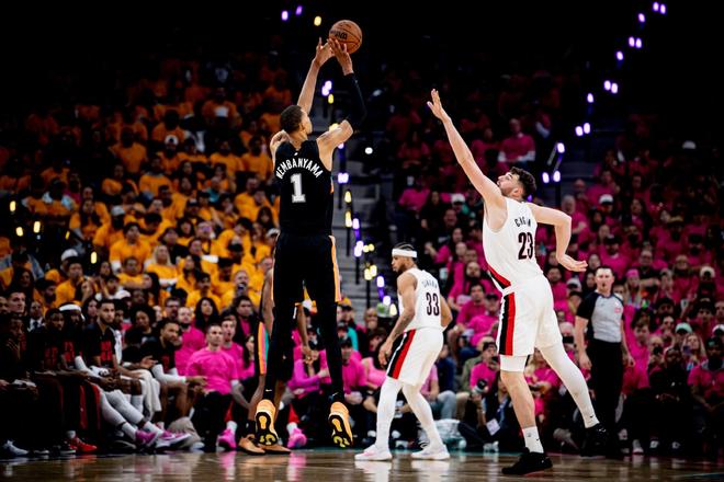 单防这个词汇,对于文班亚马来说是不存在的。同位置领先的身高,结合同位置顶级的控运和投射,面对曾经闪耀全美的克林根,文班亚马得分如探囊取物般轻松。所以开拓者尝试了联防,企图守卫禁区,但也无济于事。进攻端摧枯拉朽,防守端更是遮天蔽日。开拓者就这么被碾压,一直到末节。不过开拓者也足够坚韧,一直咬着分差不至于被打崩。看到这里,文班亚马便率队打出一波进攻高潮,直接终结比赛悬念。当一个比自己队内中锋还高的球员,在场上投出漂移三分的时候,开拓者就应该知道,这场比赛的结局如何了。全场比赛,文班亚马独得35分,超越邓肯,成为马刺队队史季后赛首秀最高得分球员!