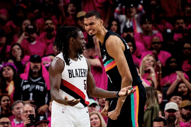 因为,今天文班亚马迎来了自己的季后赛首秀!在开拓者锁定西部第七的时候,我们听到了一些声音,都是在说开拓者或许能给马刺队带来一些威胁。当然不是觉得能黑七,而是觉得开拓者会让马刺队掉层皮,因为马刺队整体太年轻,而文班亚马在常规赛虽然展现出强大的统治力,但季后赛中可是一个新兵蛋子。虽然开拓者也不是很成熟,但队内有一个冠军后卫霍勒迪。