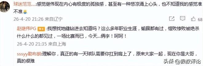 随后,赵继伟在社媒补充回应:“我想找地缝钻进去知道吗?这么多年职业生涯,输赢都有过,惜败惨败被绝杀什么什么的都见过,一场比赛而已,今天…俩字!呵呵!”。