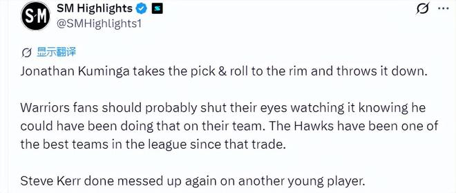 美媒SM Highlights晒出了一段库明加借助挡拆冲击篮下扣篮的视频,毫不客气地批评勇士主帅科尔:“乔纳森・库明加借挡拆直冲篮下,完成暴力扣篮。勇士球迷看这一幕大概都不忍直视,心里都清楚,他本可以身披勇士战袍打出这般表现。自从那笔交易之后,老鹰一跃成为联盟顶级强队之一。史蒂夫・科尔又一次在年轻球员的抉择上看走了眼。”
