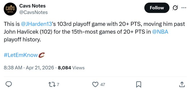 季后赛首轮首组2-0诞生,36岁哈登持续爆发一战迎3大里程碑!骑士队3大核合砍83分触发队史系列赛必胜定律。