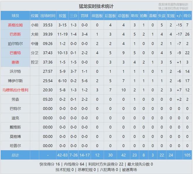 本赛季常规赛,猛龙三分命中率35.4%,仅排联盟第21位,场均得分同样是联盟第21。说回今天这场比赛,英格拉姆和巴恩斯轮流打铁,第一节这哥俩合计5中0得到0分3篮板2助攻。猛龙从一开场就被骑士压制,从来没有领先过。