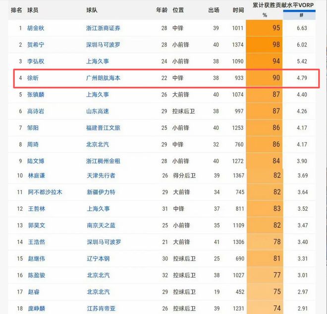徐昕在离开杜锋租借加盟广州男篮后,打出了全明星级别的表现。本赛季徐昕场均出战24.6分钟,能够得到11分8.4篮板1.9盖帽,篮板本土第二,盖帽则是本土第一。徐昕的出色表现在高阶数据上也能体现,在MVP的最重要的参考数据(累计获胜贡献水平)上,徐昕高达4.79,位列联盟第四。