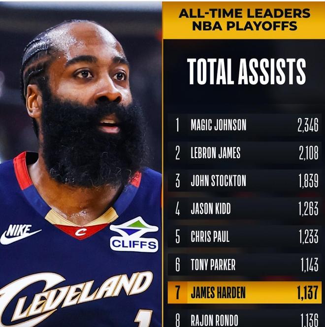 之后,哈登也迎来里程碑,为米切尔送出助攻后,哈登季后赛生涯总助攻数(1137)超越隆多(1136),升至NBA历史第7位。