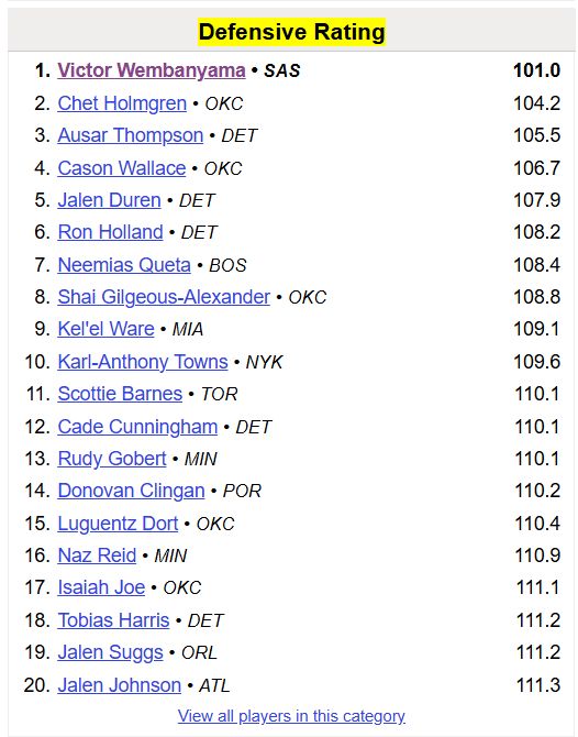 高阶数据方面,BBR所统计的防守BPM、防守效率,文班亚马全都是第一,其中防守效率榜上,前三恰好是今年的DPOY前三(这个数据的准确性其实一般)。
