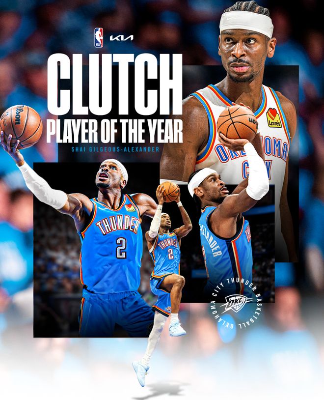 SGA今年当选关键之王是当之无愧的,他本赛季16个制胜球(反超/绝杀)联盟第一,末节合计出战287分钟拿到324分,每分钟能拿1.13分;关键时刻总分175分联盟第一,关键时刻场均6.5分也是联盟第一,关键时刻两分命中率高达61%依旧联盟第一。
