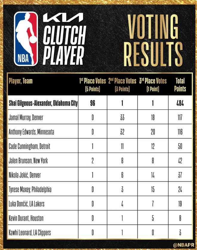 NBA官方也公布了本届关键之王的投票情况,SGA获得96张第一选票、1张第二选票、1张第三选票,总得分484分;排在第二的贾马尔-穆雷只有117分,第三的爱德华兹116分,第四的坎宁安只有50分;上届关键之王布伦森今年仅排第五。