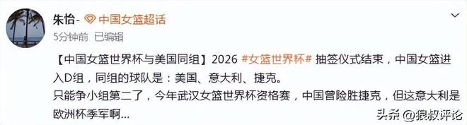 中国女篮这个签位一般般,跟美国、意大利、捷克同组,美国肯定打不赢,打捷克是上风球,打意大利也有一定的难度,毕竟此前意大利在预选赛当中击败过西班牙。