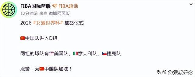 北京时间4月22日,2026女篮世界杯小组抽签仪式在德国柏林举行,中国女篮被分在D组,同组对手有美国女篮、捷克女篮和意大利女篮。