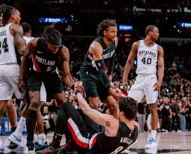 福克斯的闪电三分为马刺及时止血,瓦塞尔急停干拔跳投也稳稳命中,马刺节末稳扎稳打把比分追回。第一节比赛结束,马刺28-27反超开拓者1分。次节比赛开始,夏普低身启动,打板得手,帮助开拓者先下一城,霍勒迪拉球后撤步出手同样也有,福克斯面对防守急停急起干拔得分,夏普的追身大号三分球也一击命中。第二节开场三分钟,马刺遭遇重创,文班亚马在一次进攻突破过程中,重摔在地,倒地不起,随后返回更衣室,触发脑震荡协议本场比赛不会回归。没有文班亚马,开拓者此后的进攻有些肆无忌惮,替补主力都能冲击马刺篮下得分。