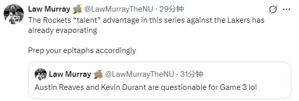 TA记者Law Murray直接发推开涮:里夫斯和杜兰特G3都出战成疑,笑死,在本轮系列赛中,火箭对阵湖人时所拥有的天赋优势已然荡然无存,各位可以提前备好悼词了。