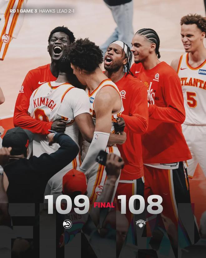 老鹰连续两场1分险胜,总比分2-1领先。对尼克斯来说,成也布伦森,败也布伦森。末节最后1分钟,布伦森2+1打成帮助尼克斯领先3分。杰伦-约翰逊自投自抢追到1分,最后16秒布伦森跳投三不沾,最后12.5秒麦科勒姆跳投反超!