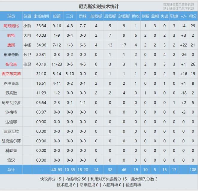 北京时间4月24日,NBA季后赛首轮G3,老鹰主场109-108险胜尼克斯。两队各有三人得分20+:约翰逊24分10板8助、麦科勒姆23分5板2断2帽、库明加21分4板;阿努诺比29分9板3帽、布伦森26分3板4助、唐斯21分17板4助2断2帽。
