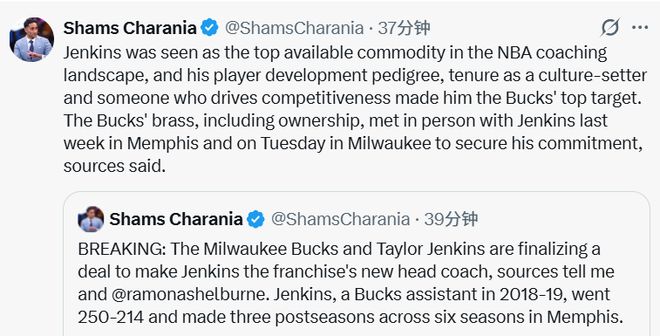 雄鹿队在常规赛末段与道格-里弗斯分道扬镳,自此便开启新帅物色工作。里弗斯本人表示,这次离职完全是他自己的决定。Shams补充表示,詹金斯是今夏教练市场的头号热门人选之一。雄鹿十分认可他在球员培养、球队文化搭建以及竞技战力打造方面的过往执教履历。另外,雄鹿这次选帅,全程未征求字母哥任何意见。