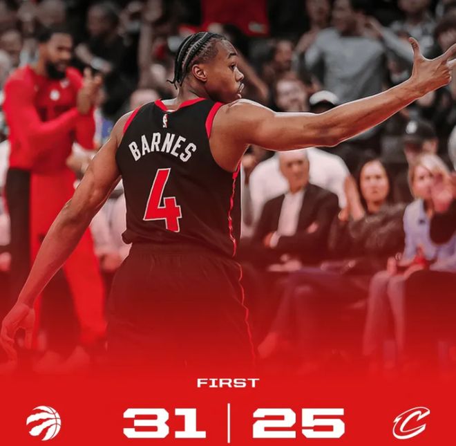 首节比赛,猛龙进攻端表现出色,全队17投12中,命中率高达70.6%,三分5投5中;其中,巴雷特5中3、三分3中3砍下11分,巴恩斯5中4、三分2中2得到10分3助攻。