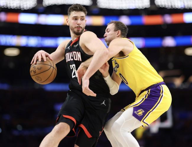 北京时间4月24日,NBA季后赛首轮G3对阵湖人赛前,火箭队球员申京接受了媒体的采访。