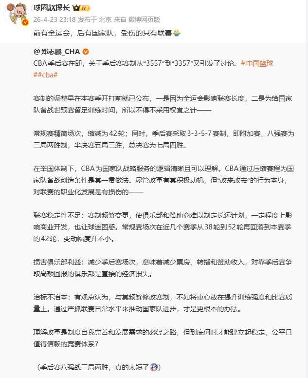 北时间4月24日消息,2026年CBA季后赛赛制再度调整,次轮(1/4决赛)由“五局三胜”压缩为“三局两胜”,整体赛程从“3-5-5-7”变为“3-3-5-7”,附加赛将于4月28日开打,总决赛最晚6月14日落幕。这一变动引发球迷强烈质疑:“常规赛冗长低质,季后赛却草率缩水”,职业联赛的稳定性与竞技尊严正被持续侵蚀。