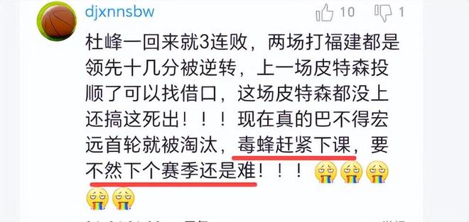 杜锋这三个错误,只要犯少一个,都能避免被逆转,这水平真的太差了。球迷也纷纷评论杜锋,“杜锋真是个蠢人!为什么在决胜局让张皓嘉和胡明轩打那么长的时间?看看两人的正负值!还有中间上焦泊乔干啥?连个球都拿不稳。国内得分最多的崔永熙和外援奎因第四节被DNP了,让人失望的广东及这个毒蜂,寒心毒蜂!”说杜锋的错误葬送了比赛,没有说错。大家说呢?你对今天杜锋的临场指挥怎么看?