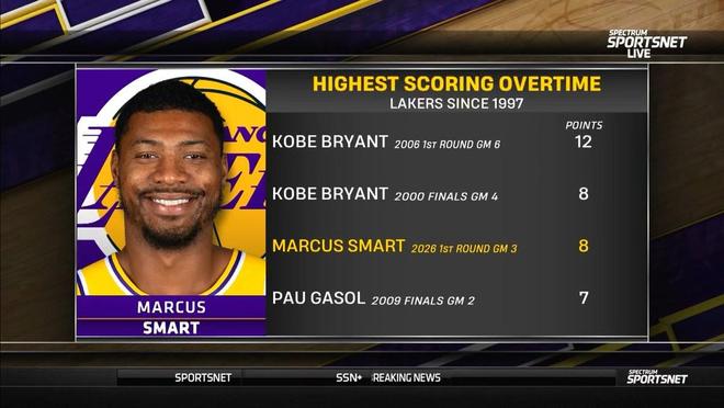 赛后根据统计,斯马特此战加时赛拿下8分也让他成为了湖人队自1997年以来,季后赛单场加时赛得分第二高的球员,仅次于2006年季后赛首轮G6加时赛砍下12分的科比。