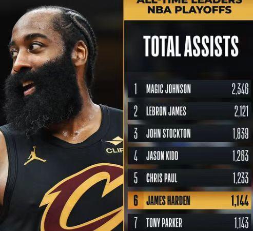北京时间4月27日,36岁的哈登再度迎来里程碑,继此前哈登季后赛助攻数超越隆多后,本场则是提升到1151次助攻,超越马刺名宿托尼-帕克1143次助攻,升至NBA季后赛助攻榜第6位迎来里程碑,现役第二仅次于詹姆斯。只是哈登首轮G4只有19分8助攻,却送出7次失误,未能阻挡骑士89-93惜败被追到总分2-2。