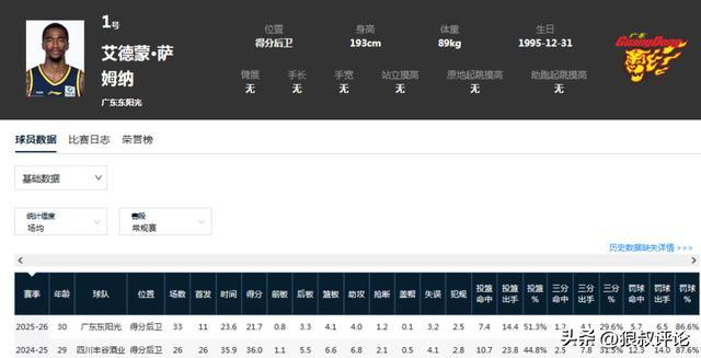 萨姆纳本赛季代表广东出战33场比赛,场均23.6分钟,得到21.7分4.1篮板4.0助攻,得分位居全队第一。他在面对北京,上海等重要的对手,分别打出过良好的表现,一旦冲起来,并没有任何对手能在一对一当中限制萨姆纳。
