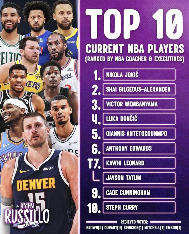 这份榜单最难以服众的地方,其实是它的公平性。塔图姆受跟腱伤势影响,本赛季至今仅仅出战了16场比赛。在出场数严重不达标的情况下,他居然还能占据并列第七的位置。对于那些拼了整个赛季、靠着一场场硬仗打出亮眼数据和战绩的球员来说,这显然是不公平的。把一个缺席了大半个赛季的球员直接放进现役前十,很难不让人怀疑投票的教练和高管们是不是完全在靠印象分投票,直接无视了常规赛最基本的出勤门槛。