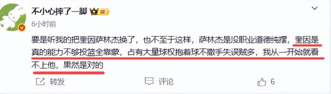 昨晚输球与奎因外线疯狂打铁关系很大,球迷说他就是毒L,打乱了球队节奏,给了广州队追分的机会。奎因不只是昨晚如此胡打,他几乎场场都是这样打,把自己当根葱,实际就是一个浪投者。一位博主说,“要是听我的把奎因萨林杰换了,也不至于这样,萨林杰是没职业道德纯摆,奎因是真的能力不够投篮全靠蒙,占有大量球权抱着球不撒手失误贼多,我从一开始就看不上他,果然是对的。”