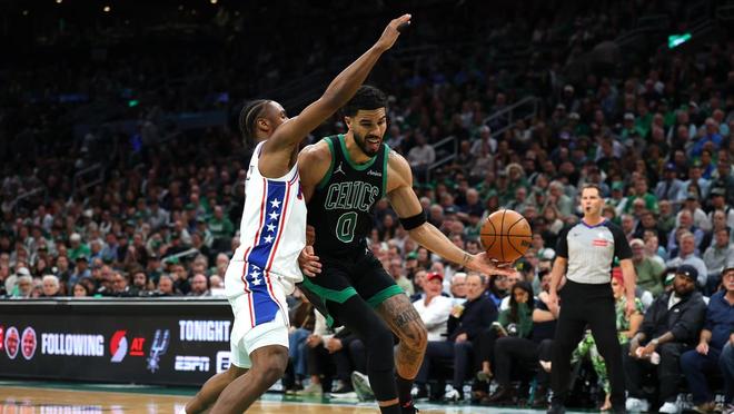 易地再战,塔图姆继续率队高举进攻大旗,埃奇库姆联手恩比德追分。不过,塔图姆外线手感火热,他率队将分差扩大至13分。费城开始找回远投手感,格莱姆斯携手乔治率队连进3分球,76人继续追分。进入末节之前,凯尔特人以86比85领先。