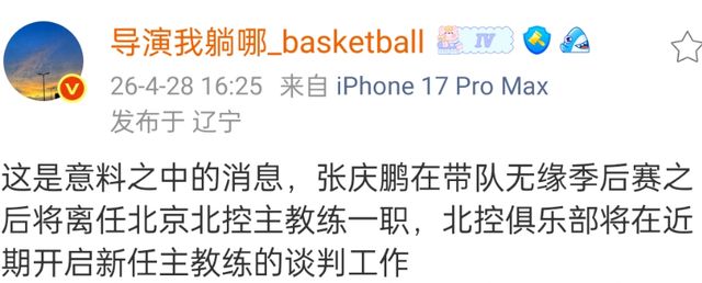 北控男篮结束赛季之后,进行了赛季总结,根据媒体人爆料,北控男篮方面决定寻找新帅,张庆鹏卸任只是时间问题,北控男篮休赛期有多大15人合同到期,必须要尽快确定新帅,才能够改造球队。