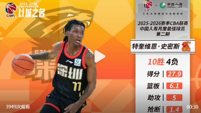 北京时间2月6日,CBA官宣2025-26赛季第二期奖项,深圳男篮成为大赢家,本土核心贺希宁当选月度最佳国内球员,深圳男篮外援史密斯当选月度最佳国际球员。