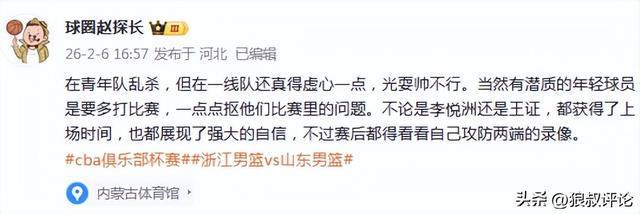 媒体人赵探长发文点评:在青年队乱杀,但在一线队还真得虚心一点,光耍帅不行。当然有潜质的年轻球员是要多打比赛,一点点抠他们比赛里的问题。