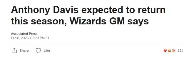 北京时间2月9日,奇才总经理威尔-道金斯表示,他预计安东尼-戴维斯本赛季能够复出,但具体复出时间表将在全明星休赛期后变得更加清晰。