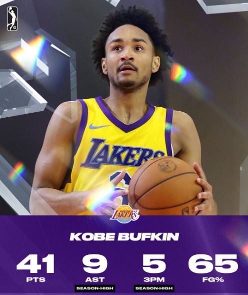 巴夫金本赛季代表湖人下属球队南湾湖人出战14场,场均能够轰下27.7分,投篮命中率52.2%,三分球43.1%,有过单场41分9助攻5三分与41分8助攻8三分的表现。