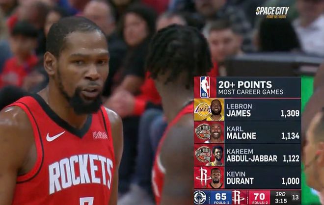 至于在现役球员当中,杜兰特1000场得分20+排在现役第二,仅次于詹姆斯的1309场纪录,杜兰特想要超越基本没有希望。