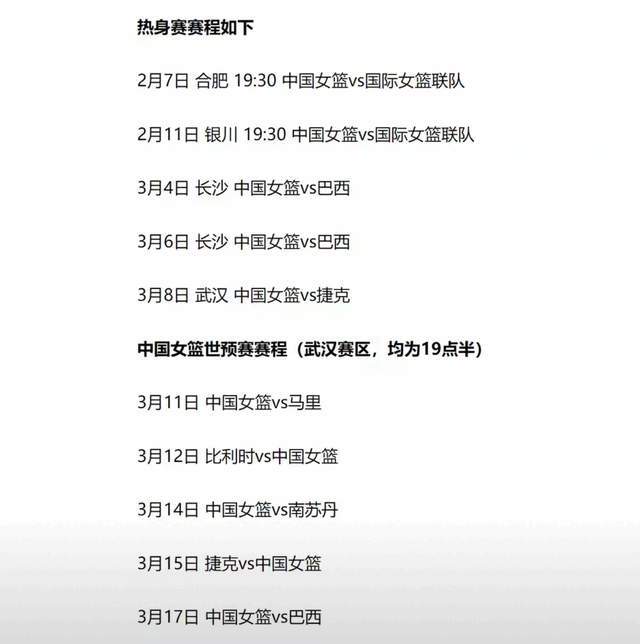 可以预测,3月份中国女篮再度集中的时候,阵容还将以这14人为基础,再适当补充一些海外球员。3月份,中国女篮要先和巴西进行2场热身赛,随后再和捷克打1场热身赛。最后,3月的湖北武汉,中国女篮就将开始世界杯资格赛之旅。