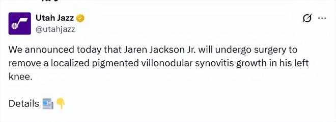 北京时间2月13日,犹他爵士队官方宣布,小贾伦-杰克逊将接受手术,移除其左膝内一处局部色素沉着绒毛结节性滑膜炎(PVNS)增生。该增生是在交易后的体检中通过核磁共振检查发现的。