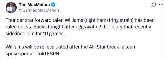 北京时间2月13日,据雷霆队发言人向ESPN透露,球队明星前锋杰伦-威廉姆斯不到四周内第二次右腿筋拉伤,将在全明星赛后接受复查。