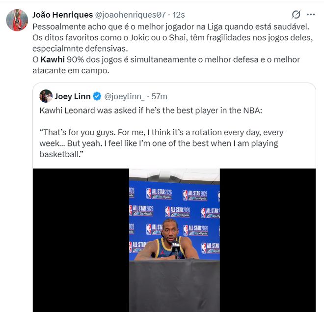 有一位欧洲记者转推后写道:我觉得小卡健康时就是联盟最出色的球员。约基奇、亚历山大这些球员都有一些弱点,特别是防守端,而卡哇伊90%的时间里是场上进攻/防守最好的那个。