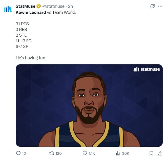 美国老年队VS世界队的比赛中,科怀-伦纳德再度打出了他战神卡的表现,在短短2分钟里一人连砍11分帮助老年队反超世界杯,单节12分钟,13中11,三分7中6,拿到31分3篮板0助攻2抢断,命中率高达84.6%,三分命中率高达85.7%,真实命中率108.2%。