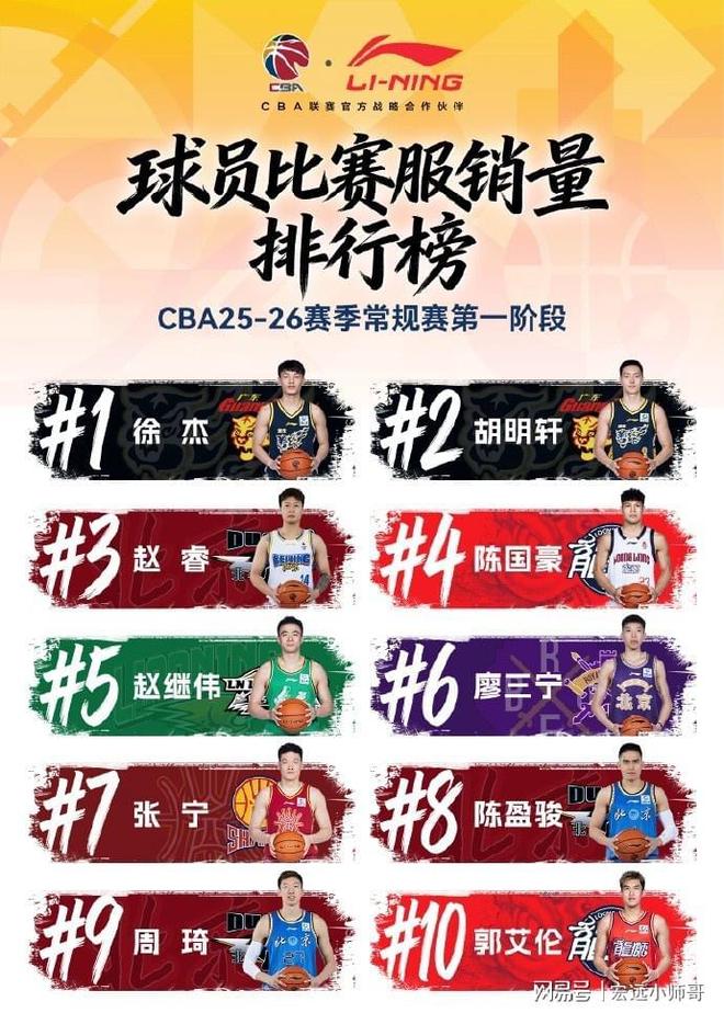 李宁公布的球员球衣前十排名依次是:徐杰,胡明轩,赵睿,陈国豪,赵继伟,廖三宁,张宁,陈盈骏。周琦和郭艾伦。