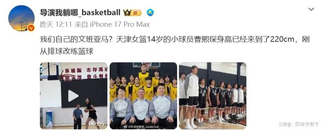 李月汝、韩旭、刘禹彤、许晨妍、张子宇,最近几年,中国女篮可谓是人才辈出,大批大个子中锋横空出世。2米07的韩旭已经是女篮中锋身高天花板,可现如今又冒出了一个2米26的张子宇。然而,在张子宇之后,中国女篮又冒出了一个2米20的大个子。根据知情人士透露,天津女篮目前拥有一名年仅14岁的天才大个子,她的身高已经达到2米20,极有可能会成为下一个女版文班亚马。