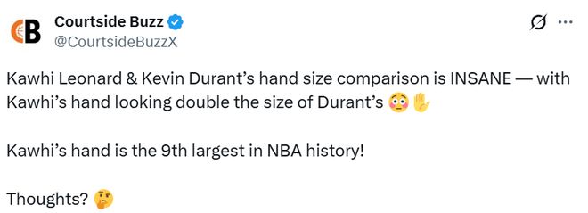 北京时间2月17日,美媒Courtside Buzz晒出了一张全明星赛的击掌图,并配文写道:“科怀-莱昂纳德和凯文-杜兰特的手掌大小对比简直太惊人了——科怀的手看起来是杜兰特手掌的两倍大。科怀的手是NBA历史上第九大的手!有什么想法?”