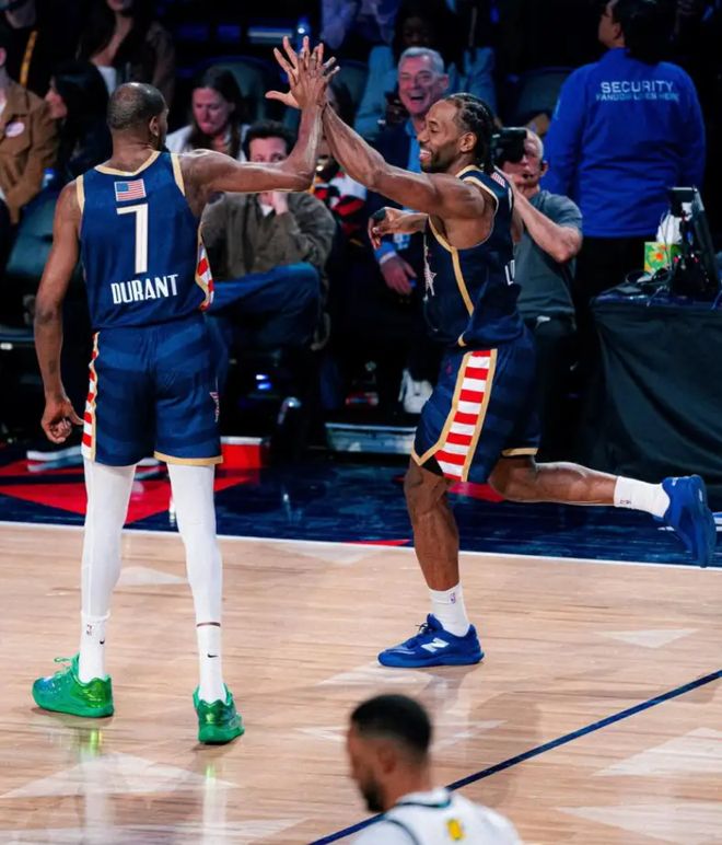 科怀-伦纳德在个人IG上发布了一组全明星周末的图集,他与杜兰特击掌时能看出两人的手掌差距之大,伦纳德一直都是以臂展、手掌大著称,杜兰特臂展也很长但他的手掌却很小,上图就能说明两人的静态天赋有着较大的差距。