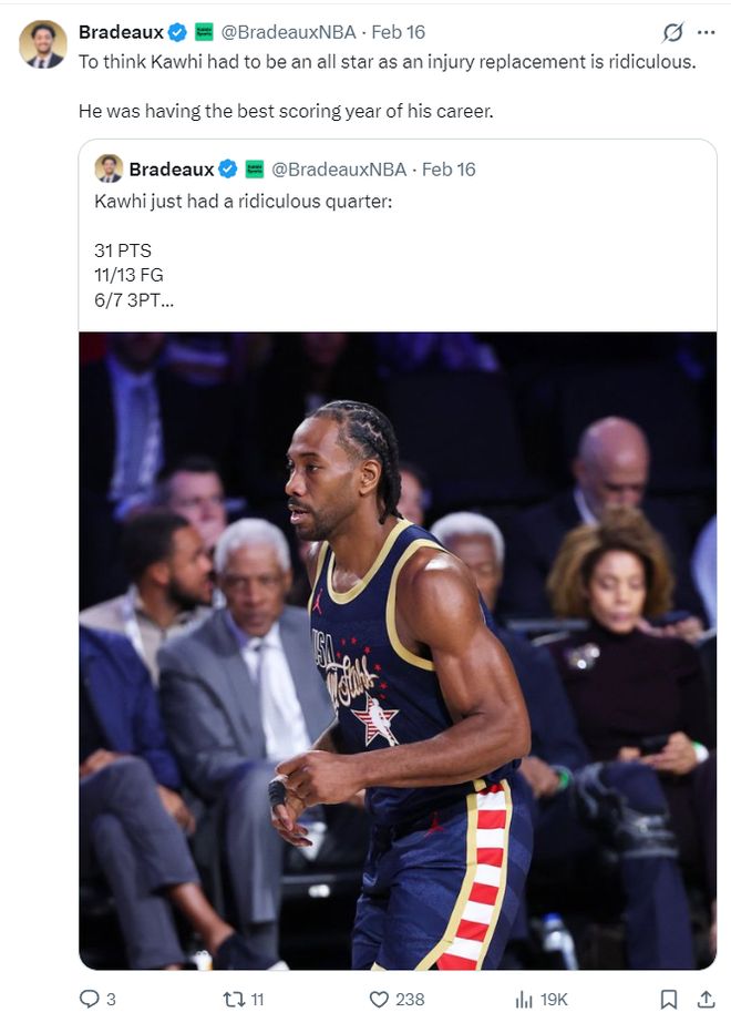 休媒Bradeaux写道:要说伦纳德能在全明星没上受伤的情况下进入那太荒谬了。不过他这一年在得分方面的确极为出色,这是他职业生涯最出色的一个赛季。