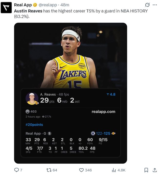 根据数据媒体Real写道:里夫斯的真实命中率63.2%,他是NBA历史上真实命中率最高的后卫。
