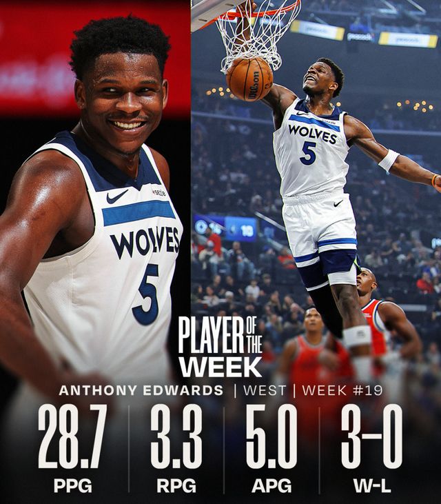 过去一周,爱德华兹率领森林狼取得3胜0负的战绩,场均28.7分3.3篮板5.0助攻。